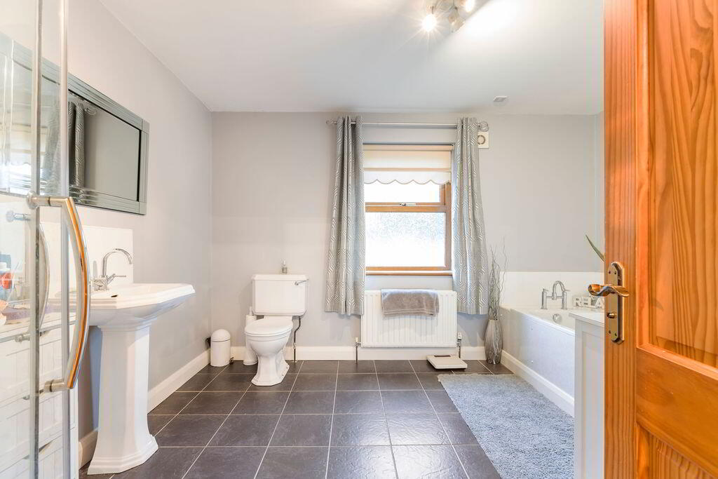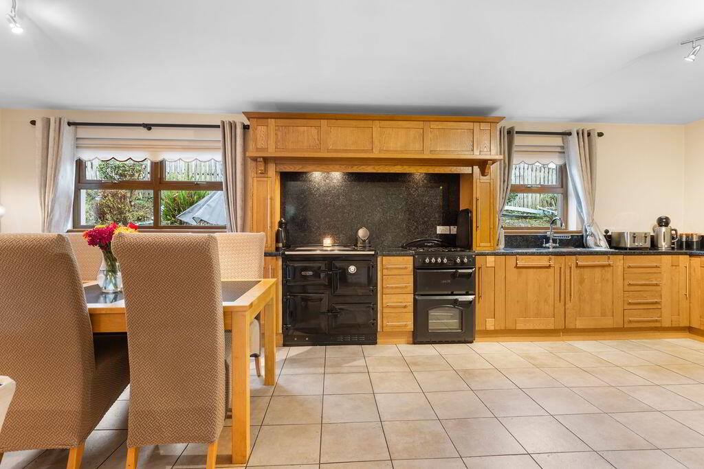 This house has accommodation over 2 floors and extends to approx. 2,750 sq. ft. Entering the property into the spacious entrance hall, there is direct access to 2 private reception rooms. There is also an open plan kitchen-diner with adjoining living room. The kitchen has an array of eye and low-level units, an extensive worktop along with both a gas cooker and an oil-fired Rayburn Stove. There is also ample accommodation for a large dining table and chairs.