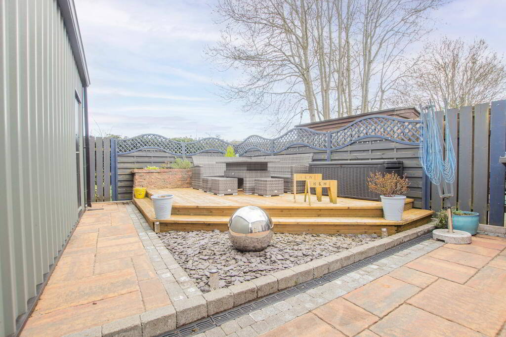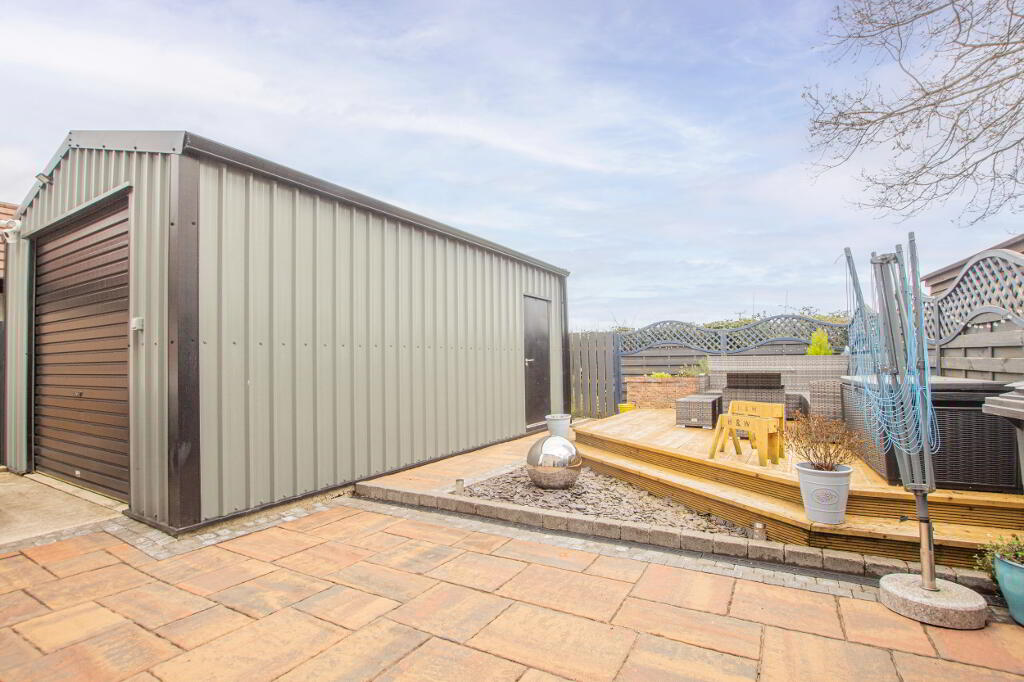 Externally, the property provides for parking of several vehicles to the front and side. To the rear of the house, there is a large garage along with outside living space comprising of elevated decking and a seating area.